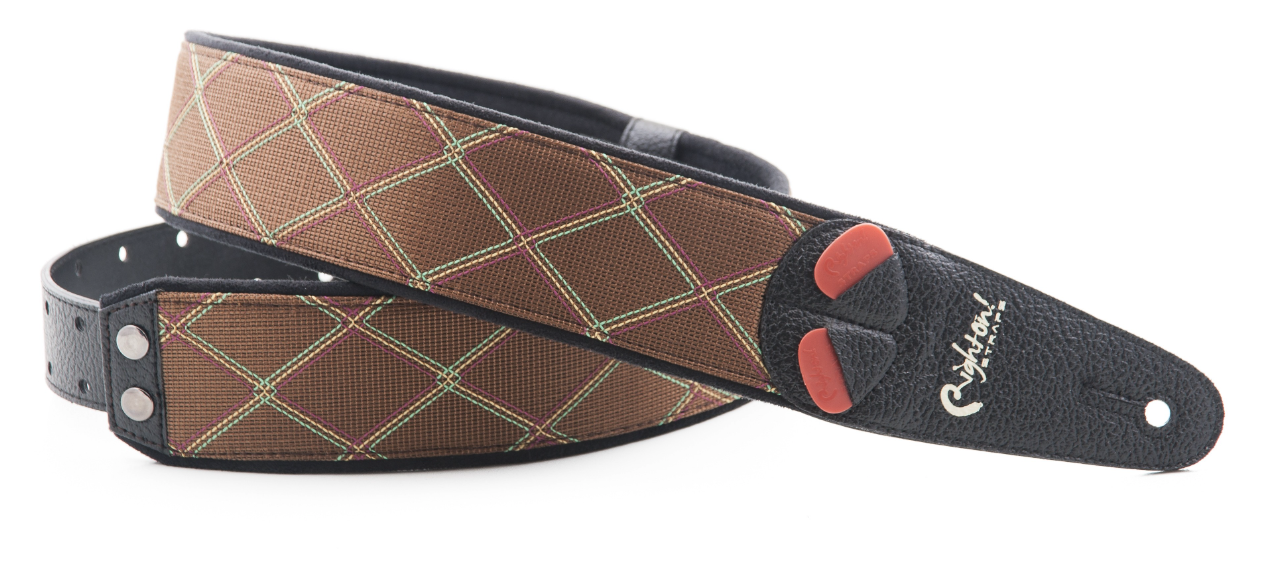La correa Diamond Brown es una correa inspirada en los diseños clásicos de amplificadores, en este caso de la conocida marca VOX, y su archiconocido modelo AC30 y de la reconocida tela de la pantalla de amplificador original  formada por rombos multicolores.