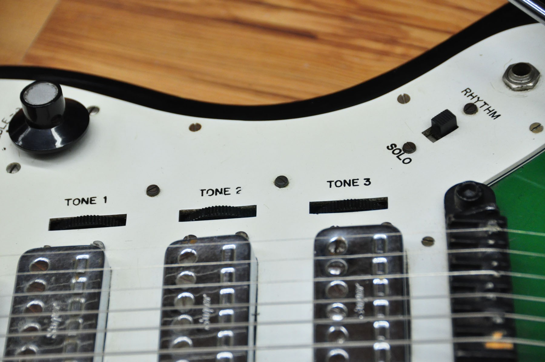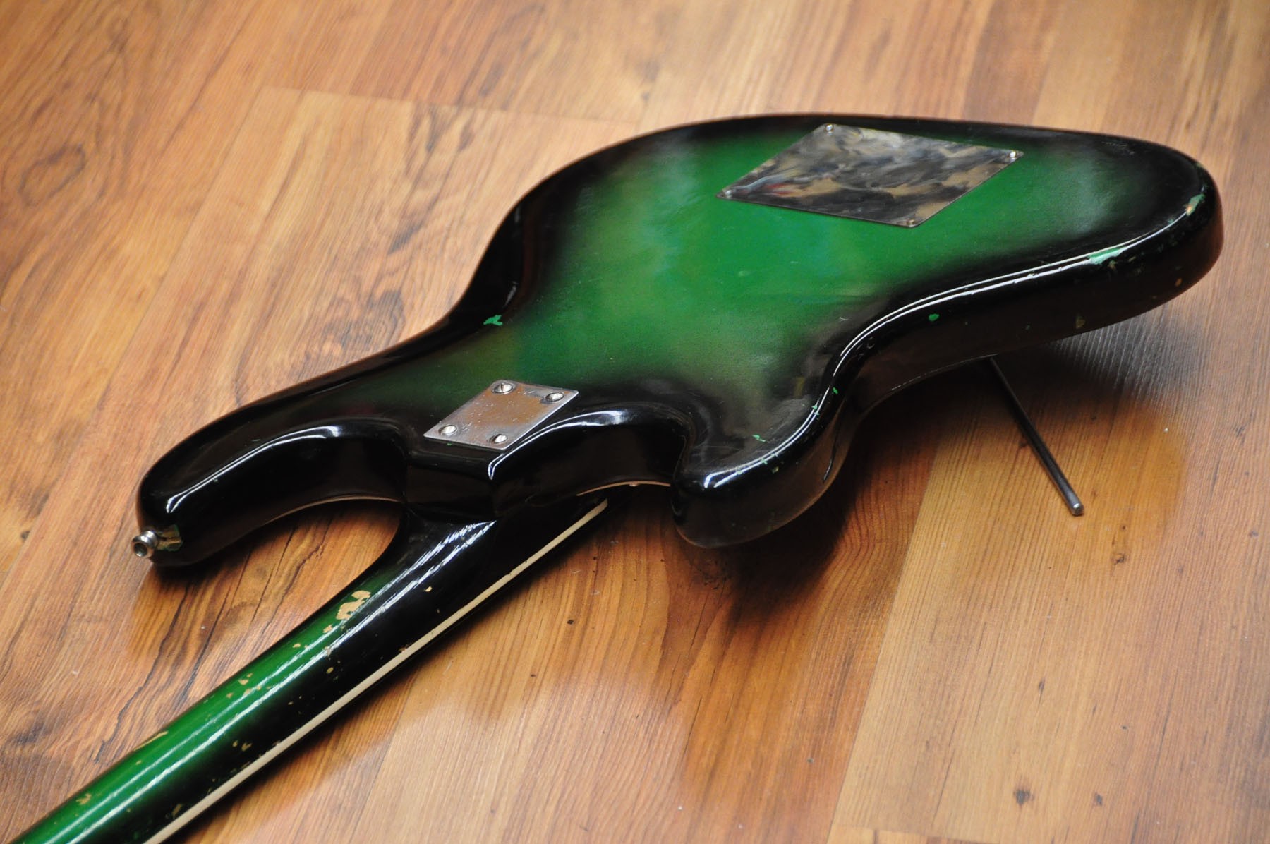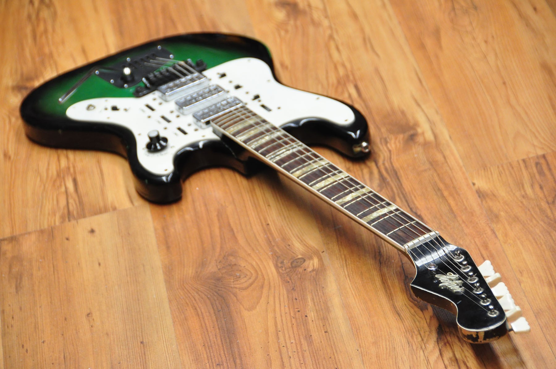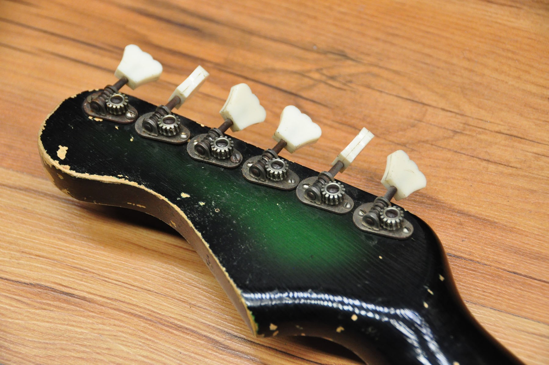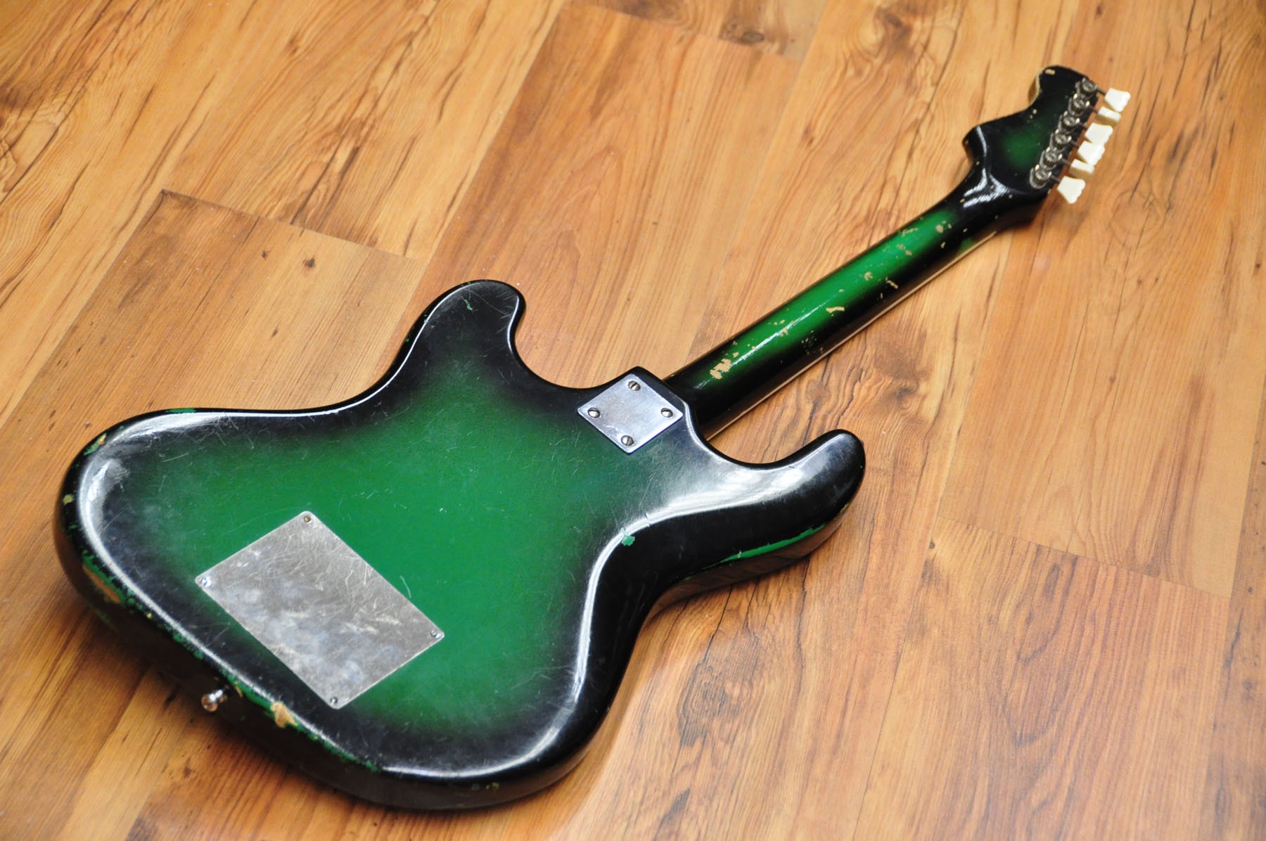 This is a very beautiful Hofner Galaxie also known as a 176 DeLuxe, made in the Hofner factory in the mid sixties. It has a rare finish: greenburst- . All the electrics are housed within the black scratchplate and the three pickups each has a tone wheel control. There is an overall volume wheel, plus bass on/off switch and on/off switches for »discant» and treble plus a four-way pickup selector switch and also a rhythm/solo switch – so plenty to choose from.