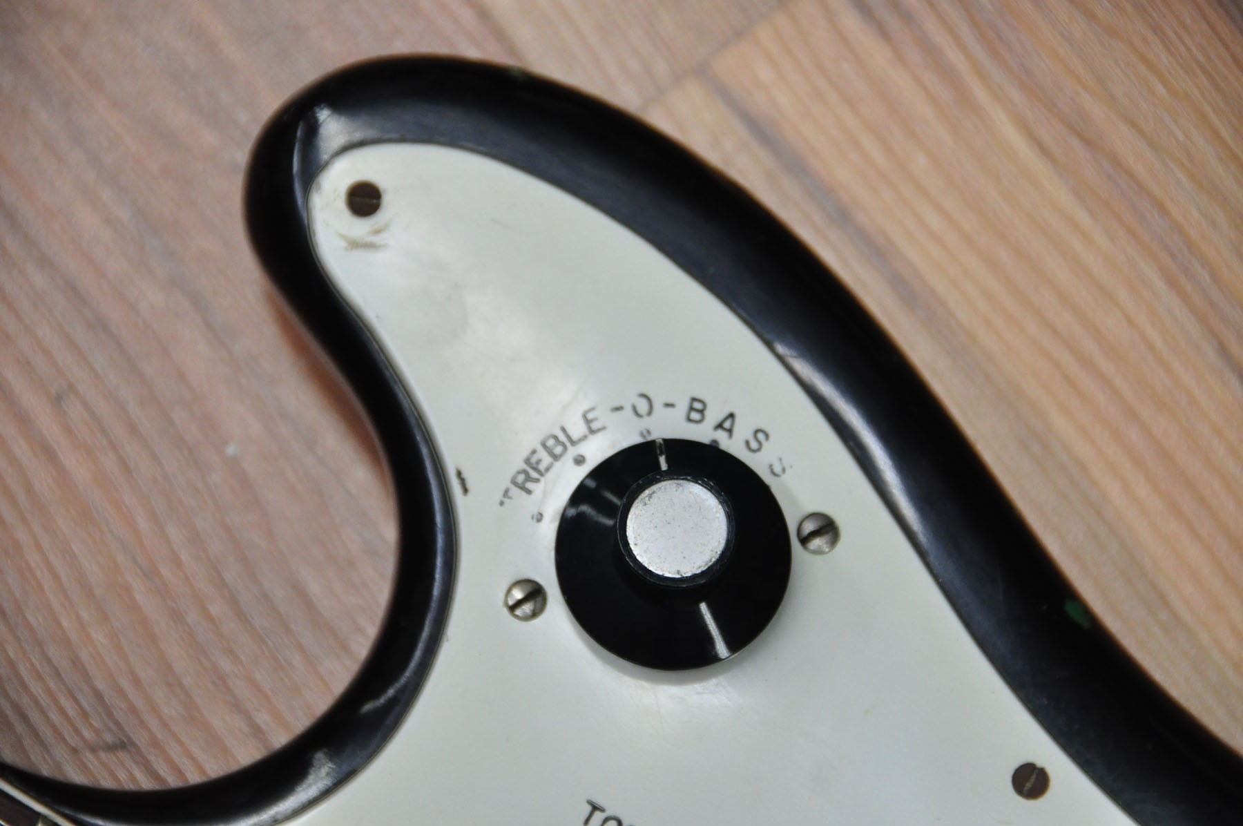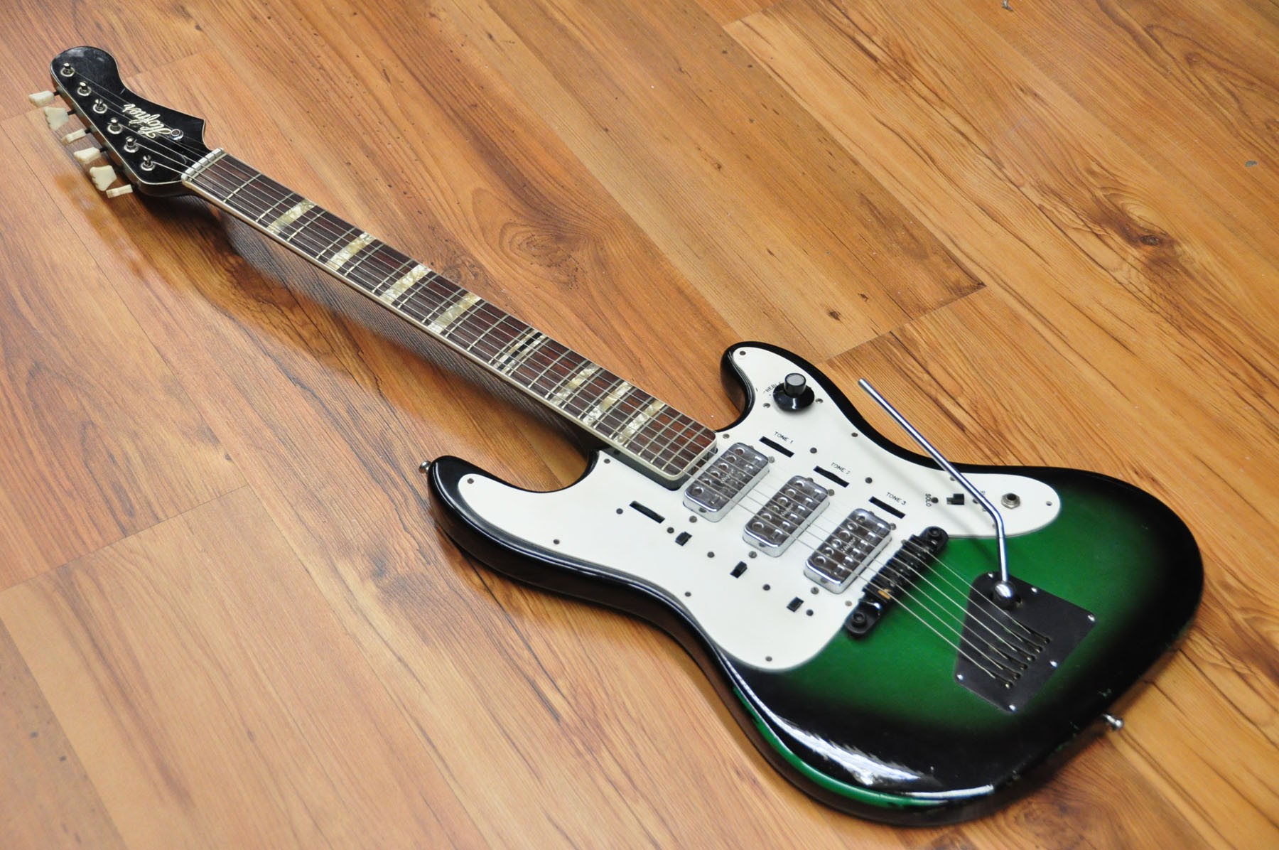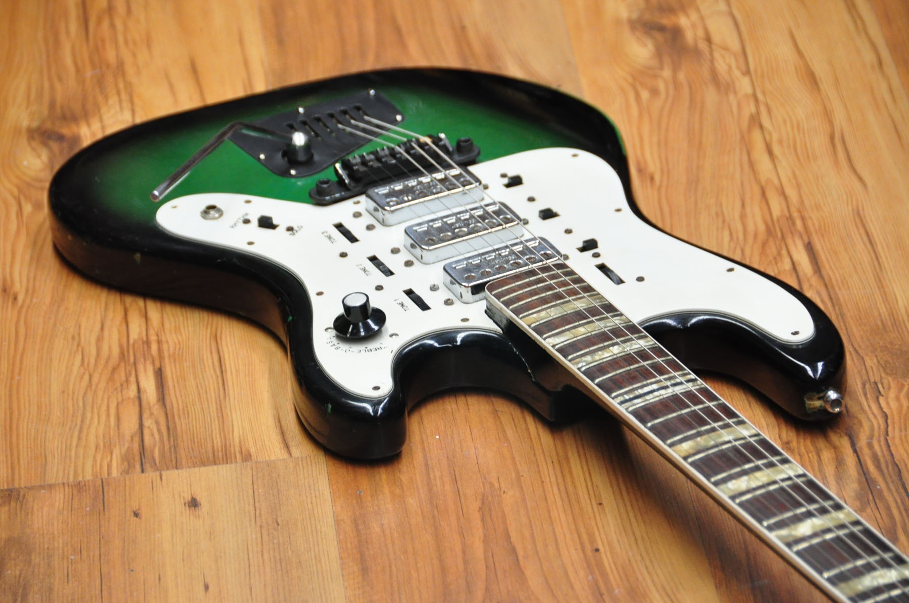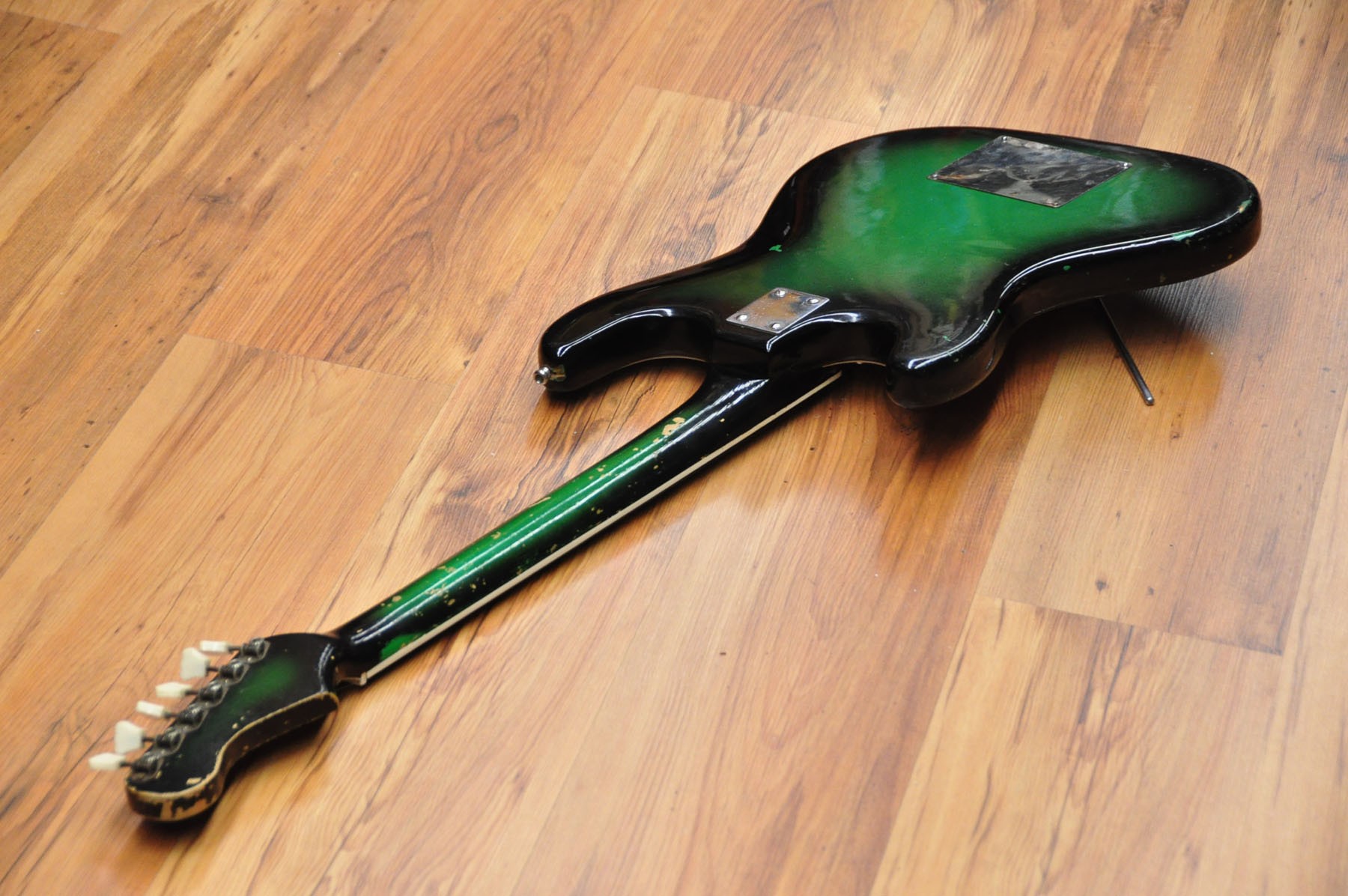 This is a very beautiful Hofner Galaxie also known as a 176 DeLuxe, made in the Hofner factory in the mid sixties. It has a rare finish: greenburst- . All the electrics are housed within the black scratchplate and the three pickups each has a tone wheel control. There is an overall volume wheel, plus bass on/off switch and on/off switches for »discant» and treble plus a four-way pickup selector switch and also a rhythm/solo switch – so plenty to choose from.