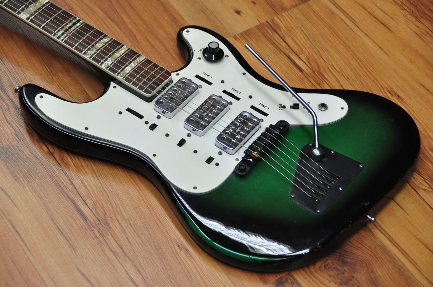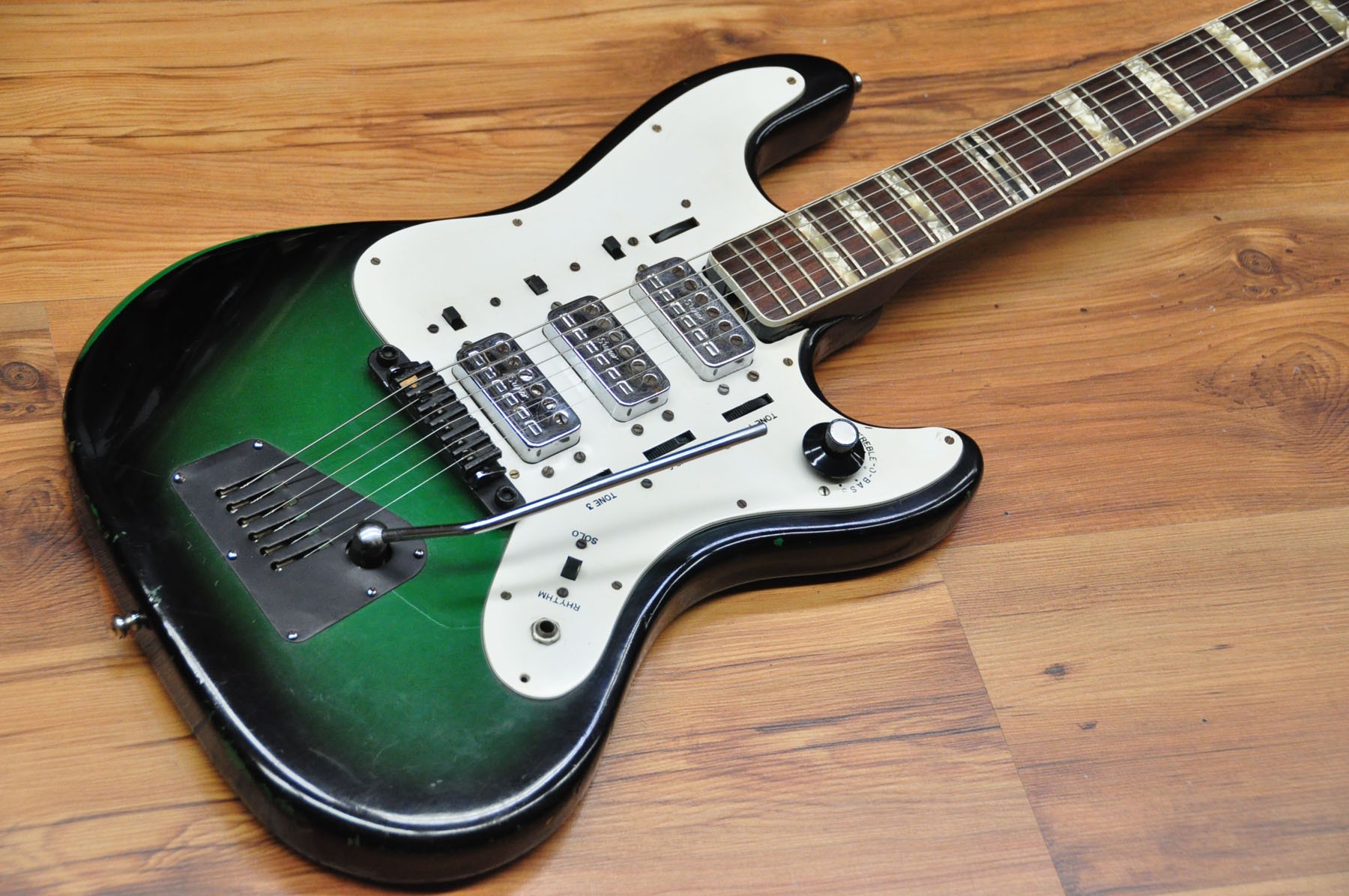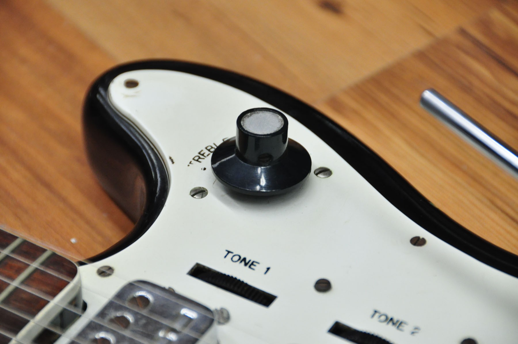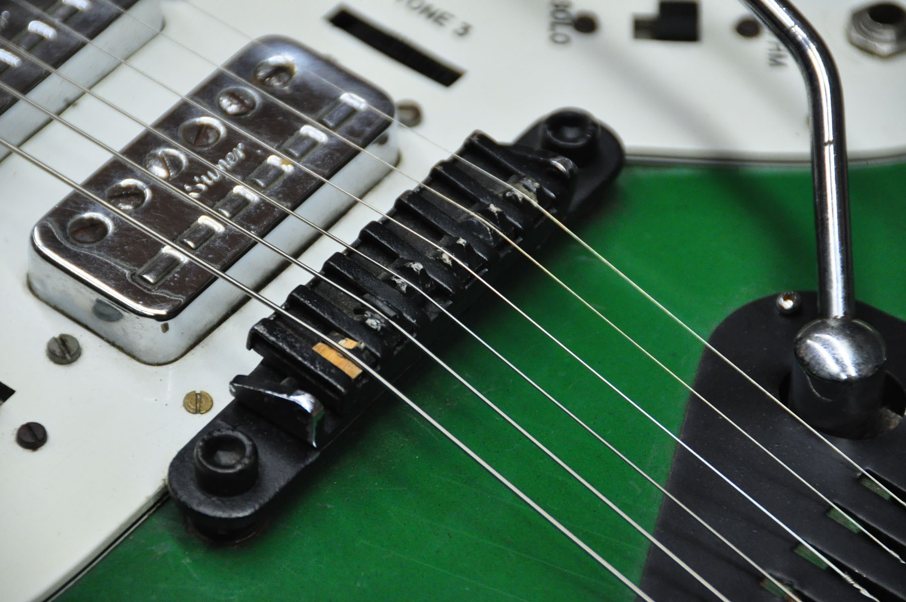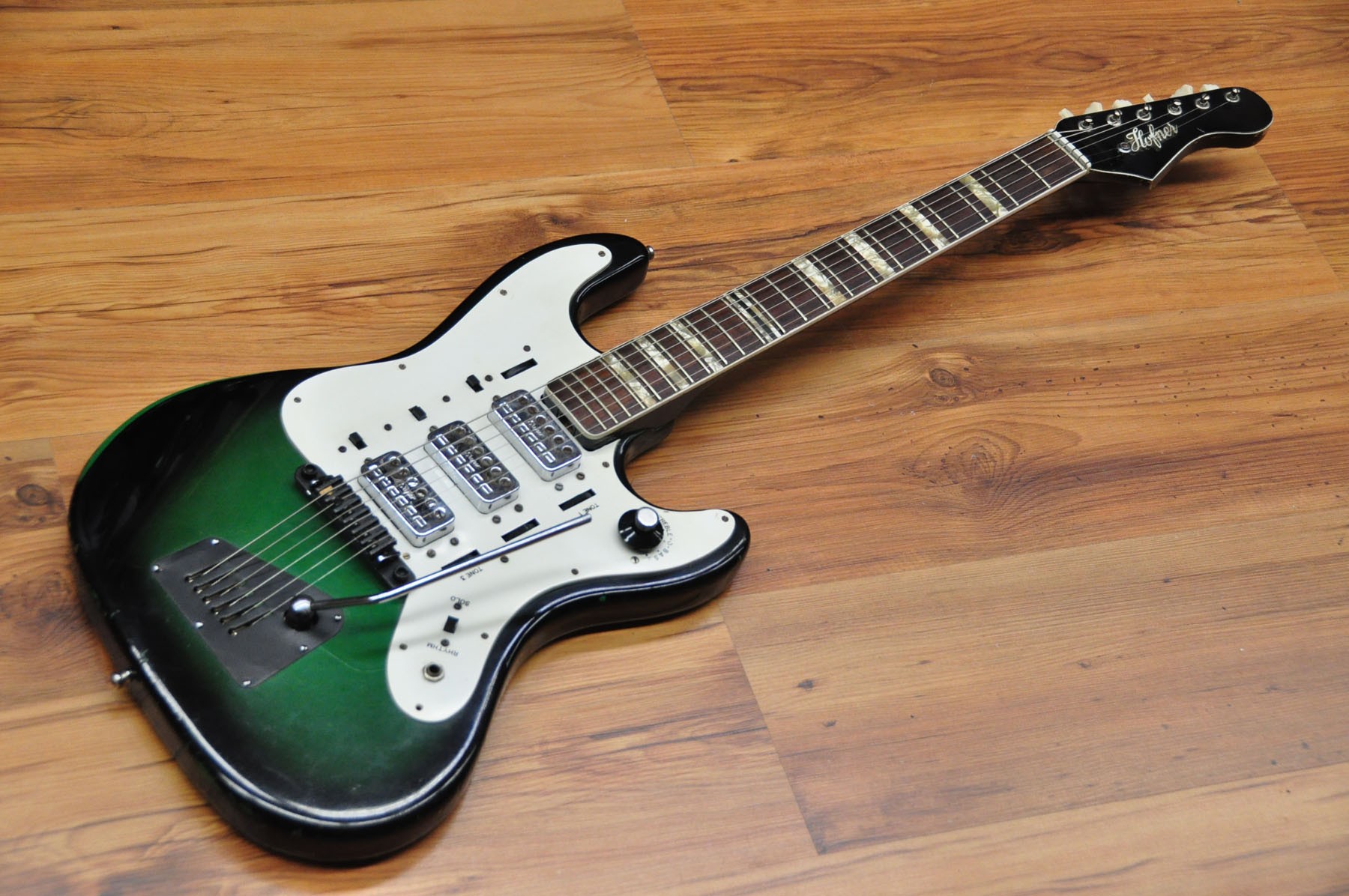 This is a very beautiful Hofner Galaxie also known as a 176 DeLuxe, made in the Hofner factory in the mid sixties. It has a rare finish: greenburst- . All the electrics are housed within the black scratchplate and the three pickups each has a tone wheel control. There is an overall volume wheel, plus bass on/off switch and on/off switches for »discant» and treble plus a four-way pickup selector switch and also a rhythm/solo switch – so plenty to choose from.