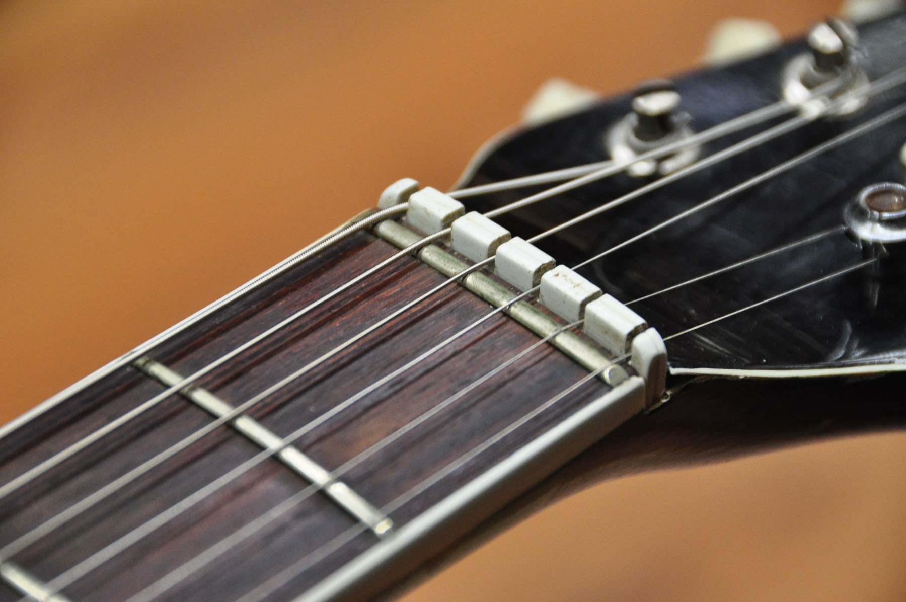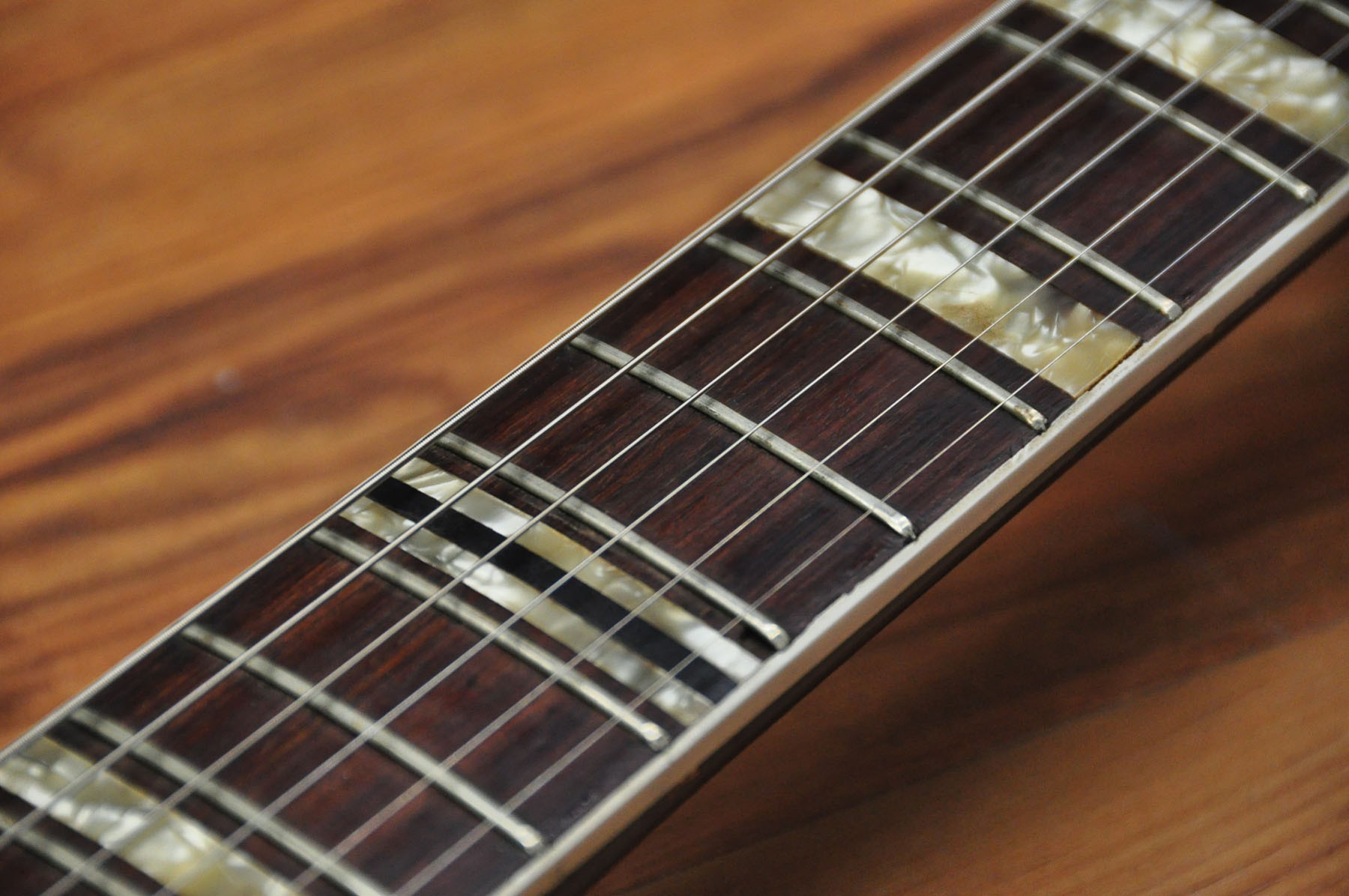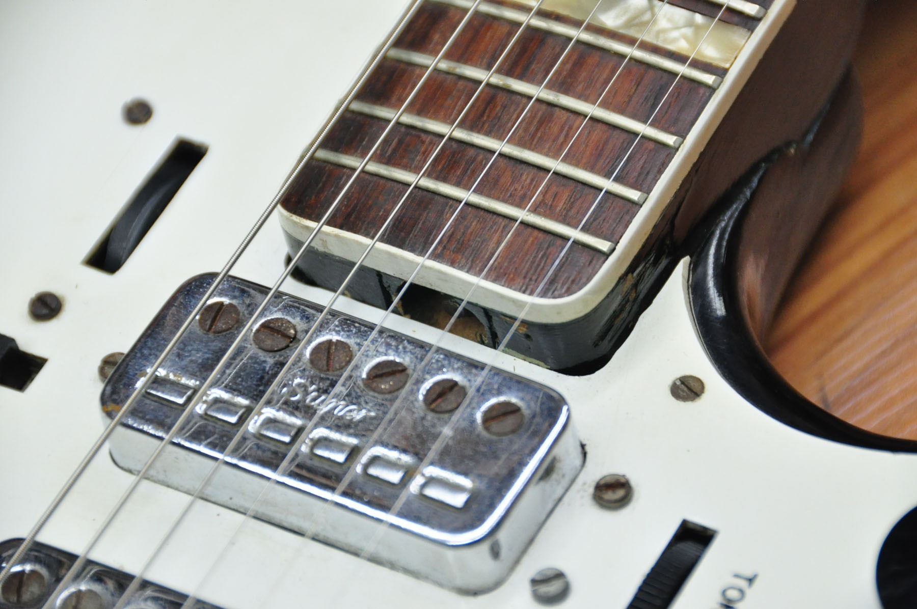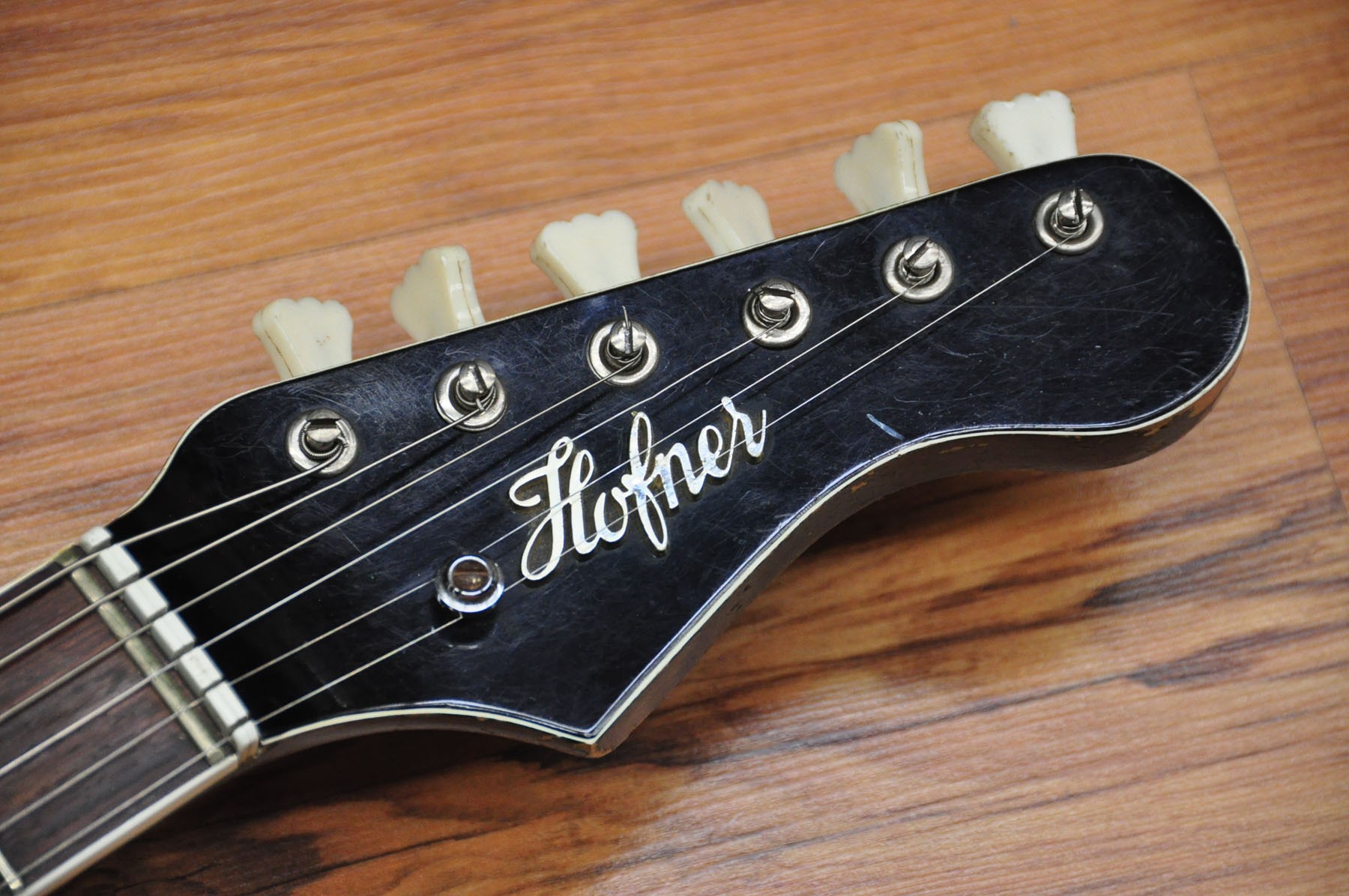 The bridge is a tune-o-matic adjustable model fitted with an original mute, and the tailpiece is a tremolo version all complete with the original arm. The bound neck is bolted on and the fretboard has full width fret markers. The headstock has a black front, the »Hofner» logo and the very desirable »butterfly» covered tuners.