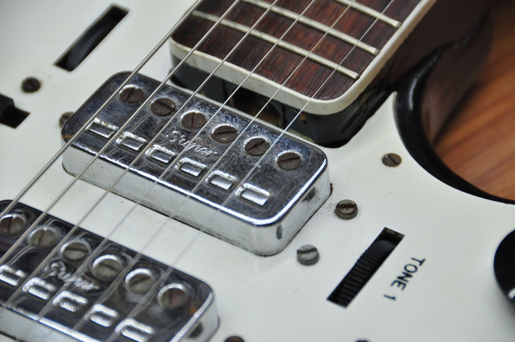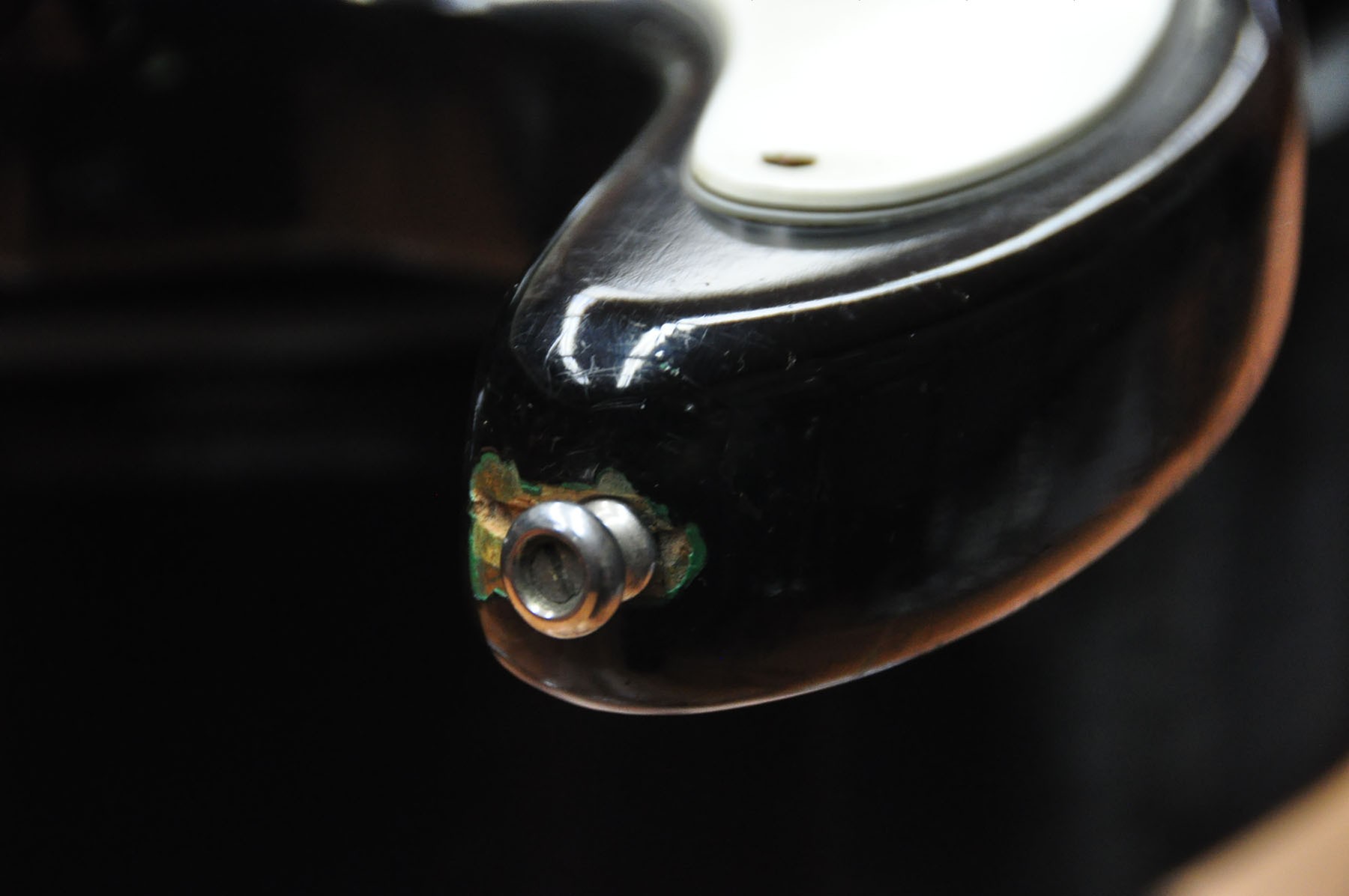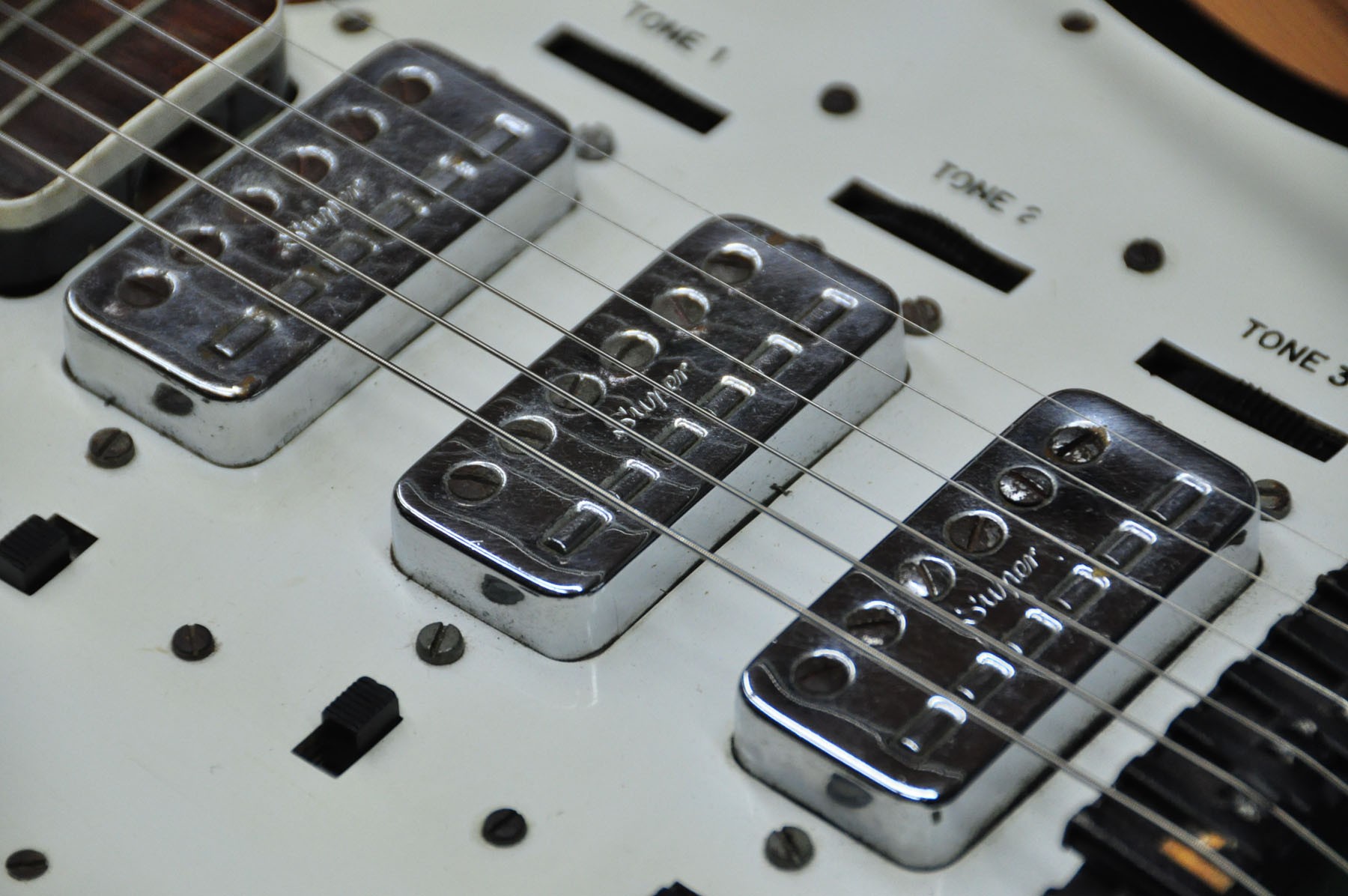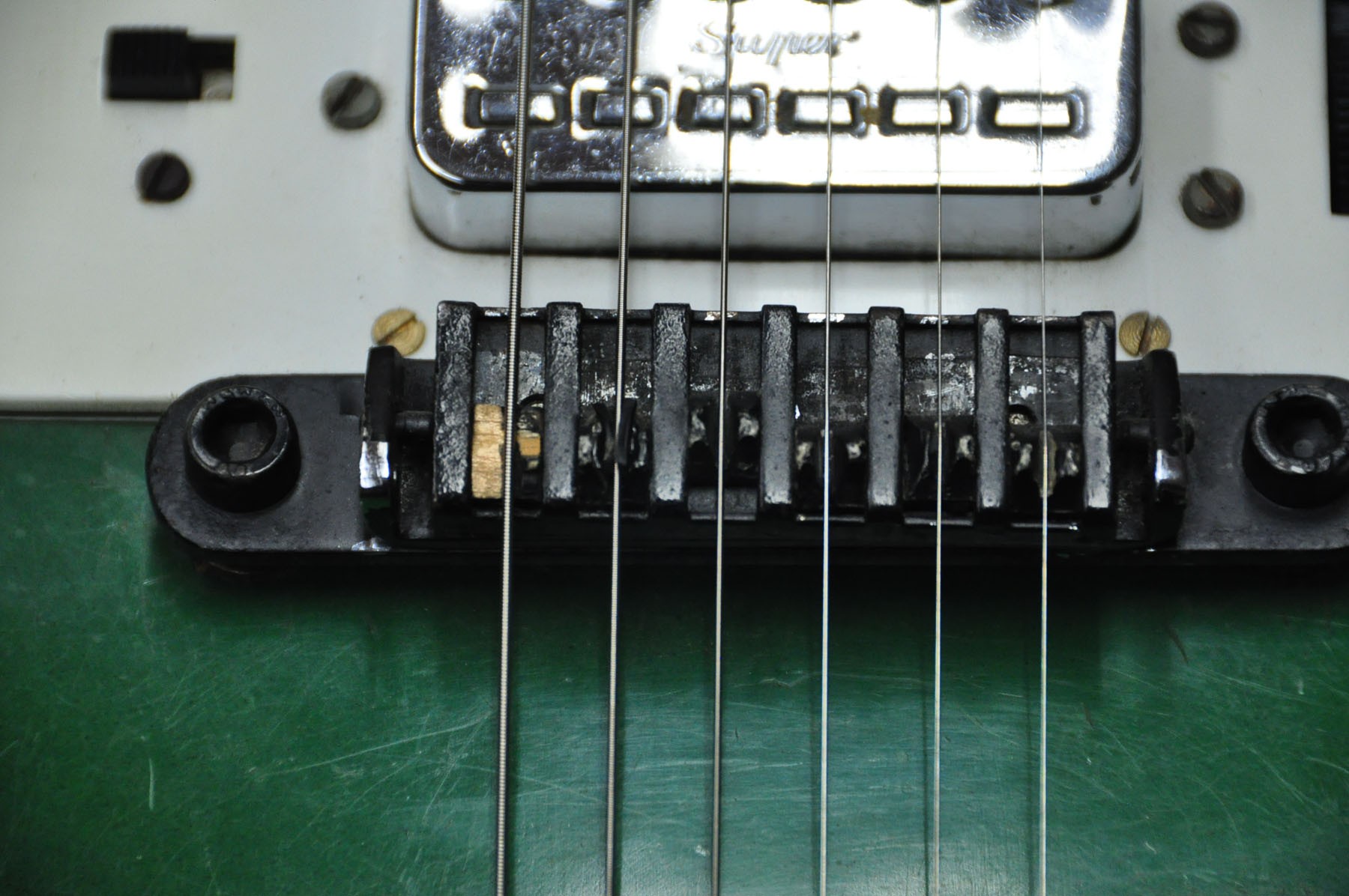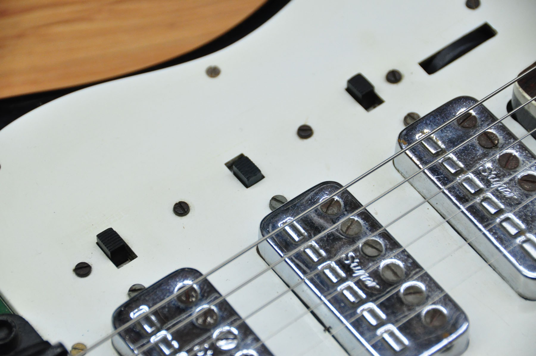 The bridge is a tune-o-matic adjustable model fitted with an original mute, and the tailpiece is a tremolo version all complete with the original arm. The bound neck is bolted on and the fretboard has full width fret markers. The headstock has a black front, the »Hofner» logo and the very desirable »butterfly» covered tuners.