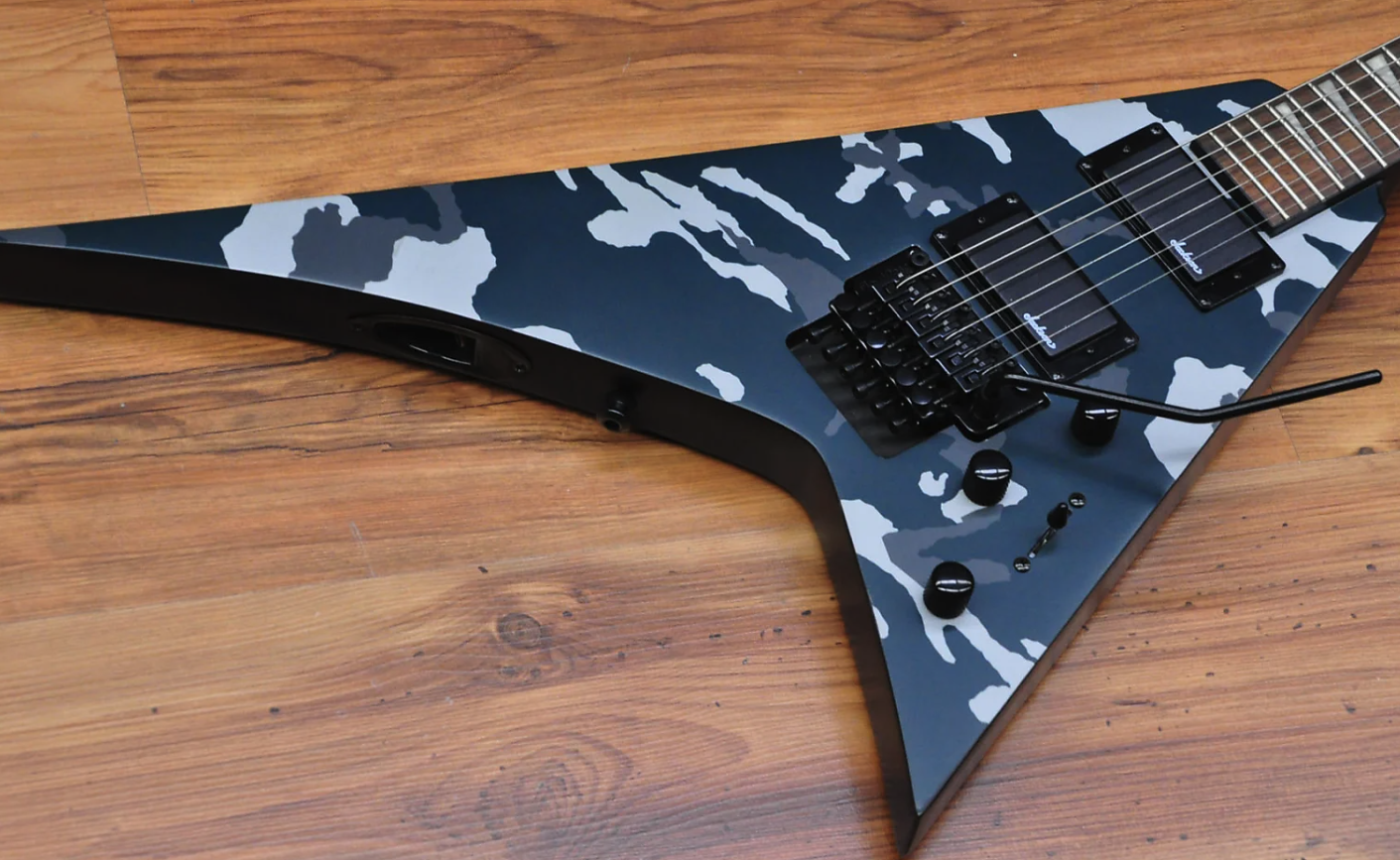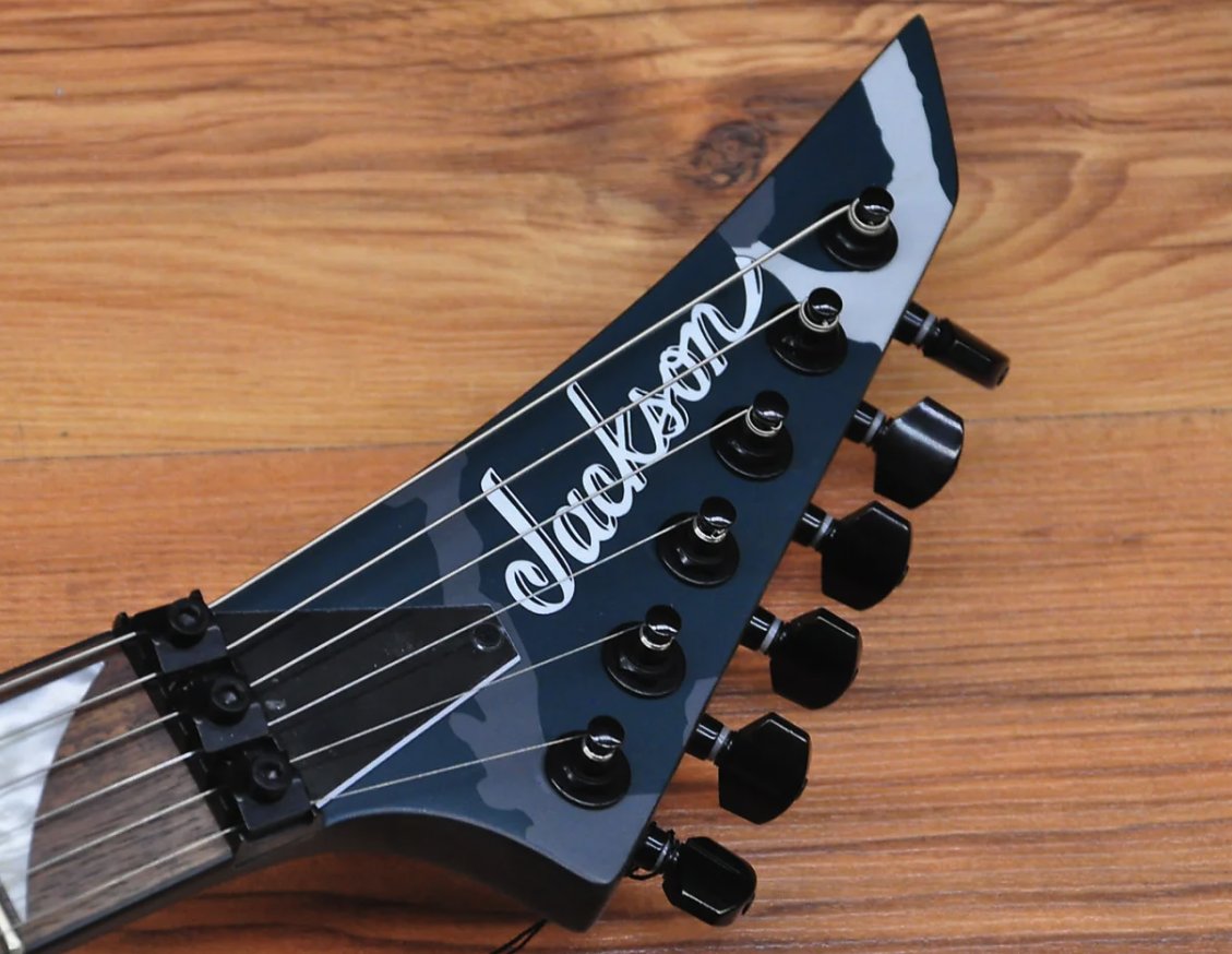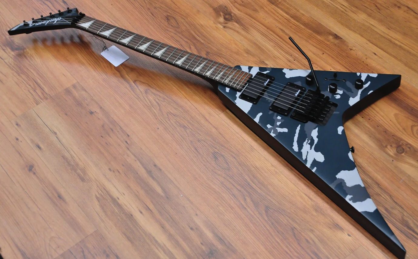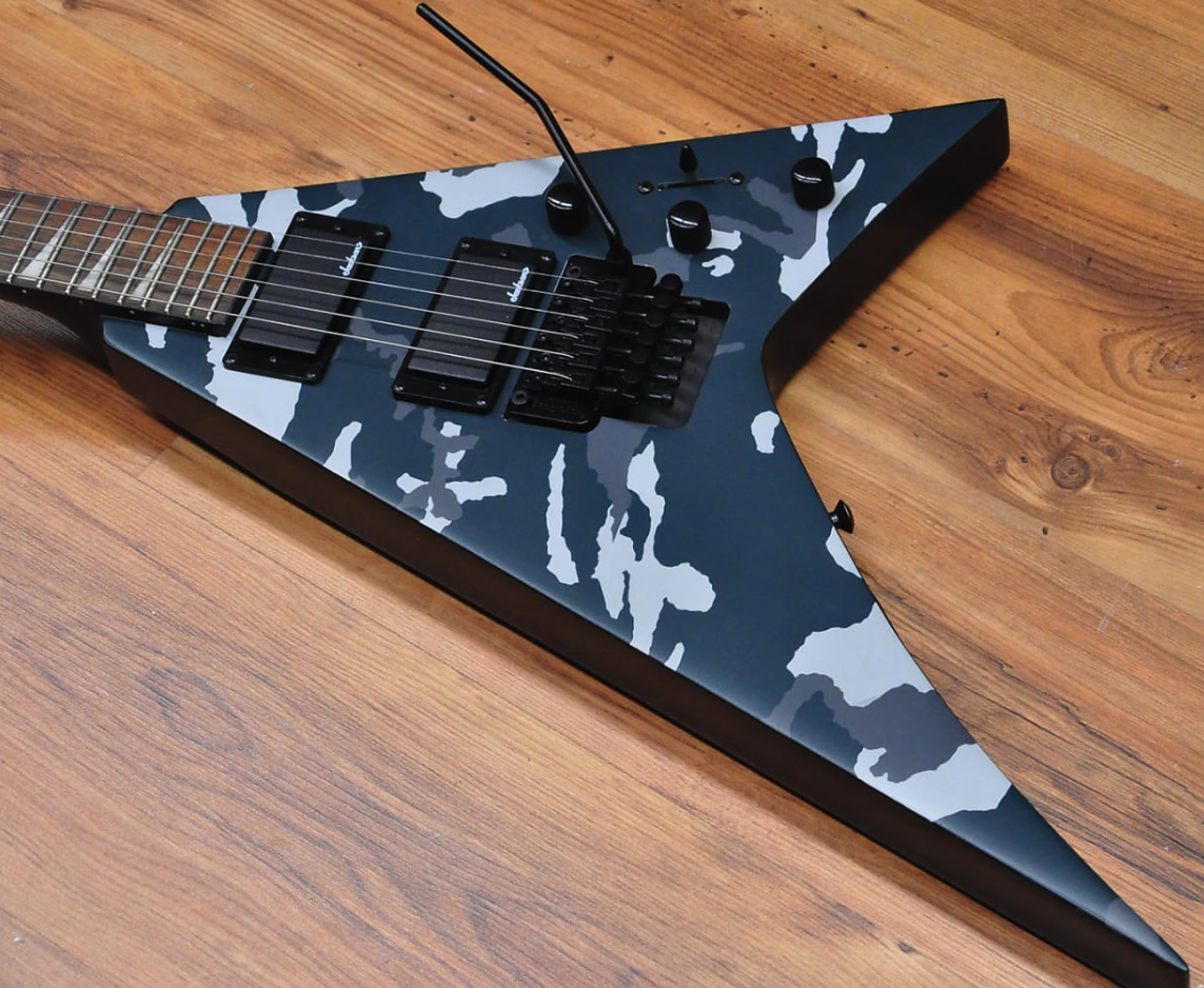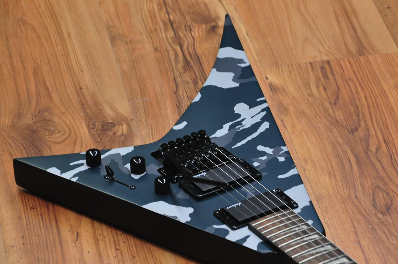 Despite its camouflage finishes, the Jackson X Series Rhoads RRX24 Camo is sure to command attention in Black Camo or Woodland Camo with a matching camo reverse pointy headstock and black hardware.