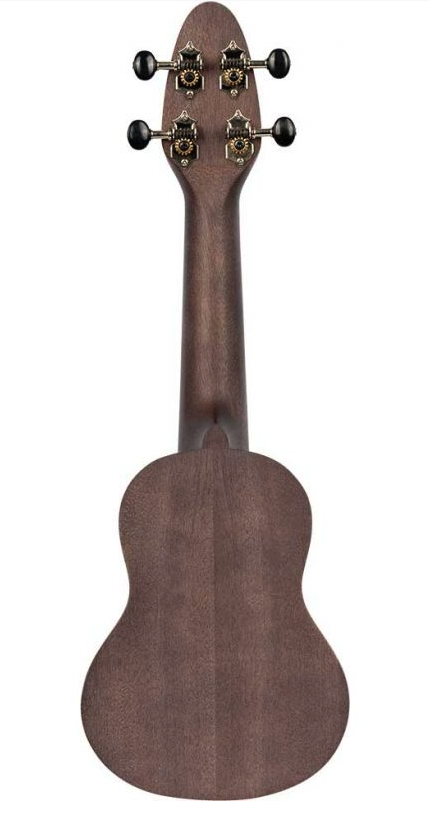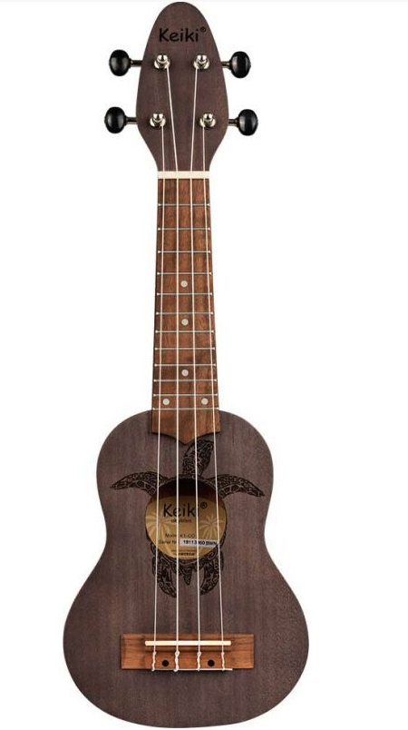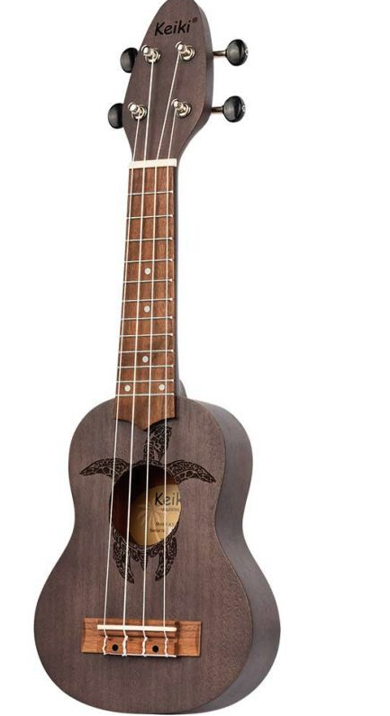 Ukelele Sopranino Keiki K1-MM. (mas pequeño que el soprano, escala 248mm). Acabado satinado en color carbon. Cuerpo y mástil de okoume, diapasón y puente de nogal. Tapa de okoume grabada a laser con diseño «tortuga´´. Clavijeros cromados y negros. Monta cuerdas Ortega UWNY-4-SO para Soprano standard.